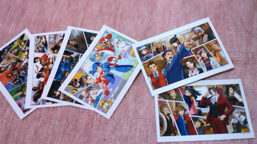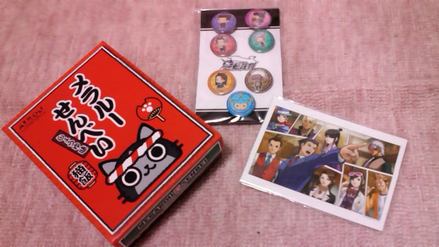 逆裁の缶バッジと、カプコンショップ限定のポスカと、メラルーせんべい。