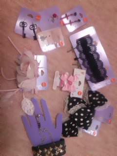 コサージュ、ピアス3個、チョーカー、リング、リボンヘアゴム2個と1セット、ブレスレット